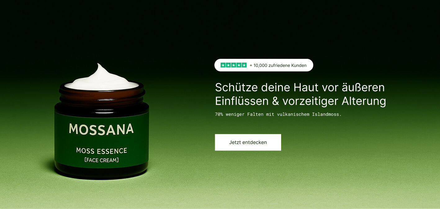 Isländisches Vulkanmoos trotzt täglich Geysiren und eisigen Winden. Um zu überleben, bildet es hochwirksame Schutzmoleküle, die es extrem resistent machen. Diese Eigenschaft nutzen wir in der MOSSANA Face Cream.